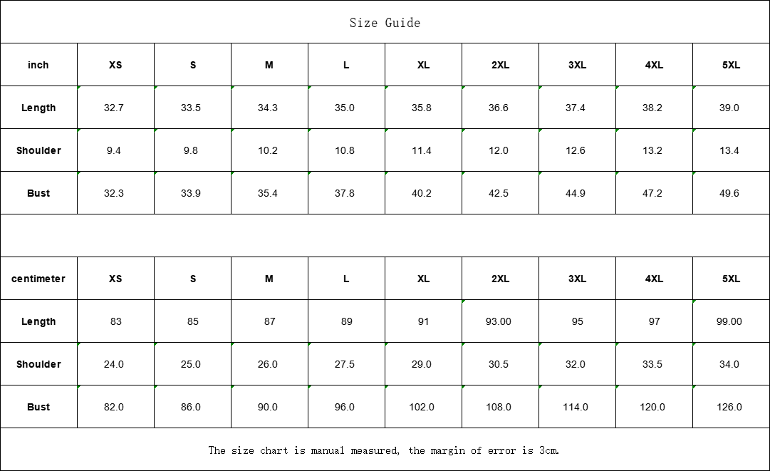 | inch | XS | S | M | L | XL | 2XL | 3XL | 4XL | 5XL |